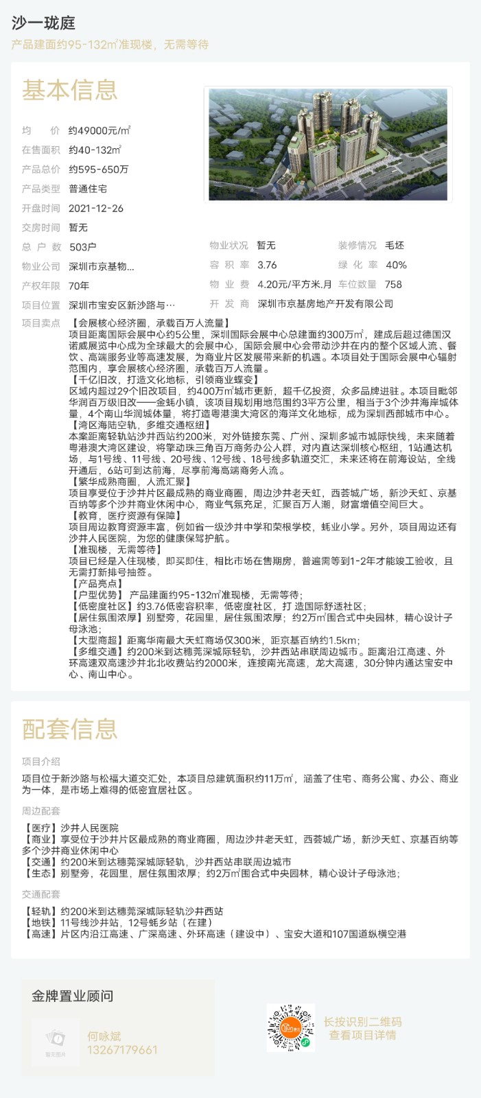 樓盤:沙一瓏庭物業類型:普通住宅戶型:1室、2室、3室、4室面積:約40-132平米總價:約595-650萬聯系人:何詠斌聯系電話:13267179661
